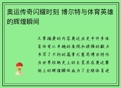 奥运传奇闪耀时刻 博尔特与体育英雄的辉煌瞬间
