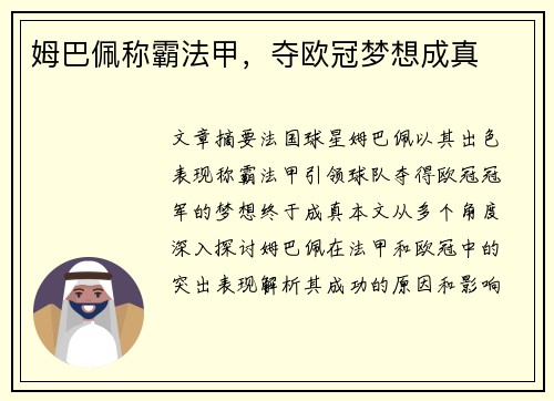 姆巴佩称霸法甲,夺欧冠梦想成真