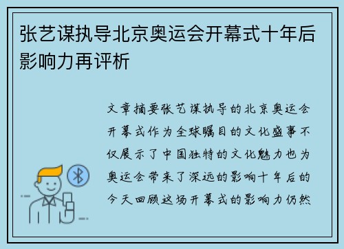 张艺谋执导北京奥运会开幕式十年后影响力再评析